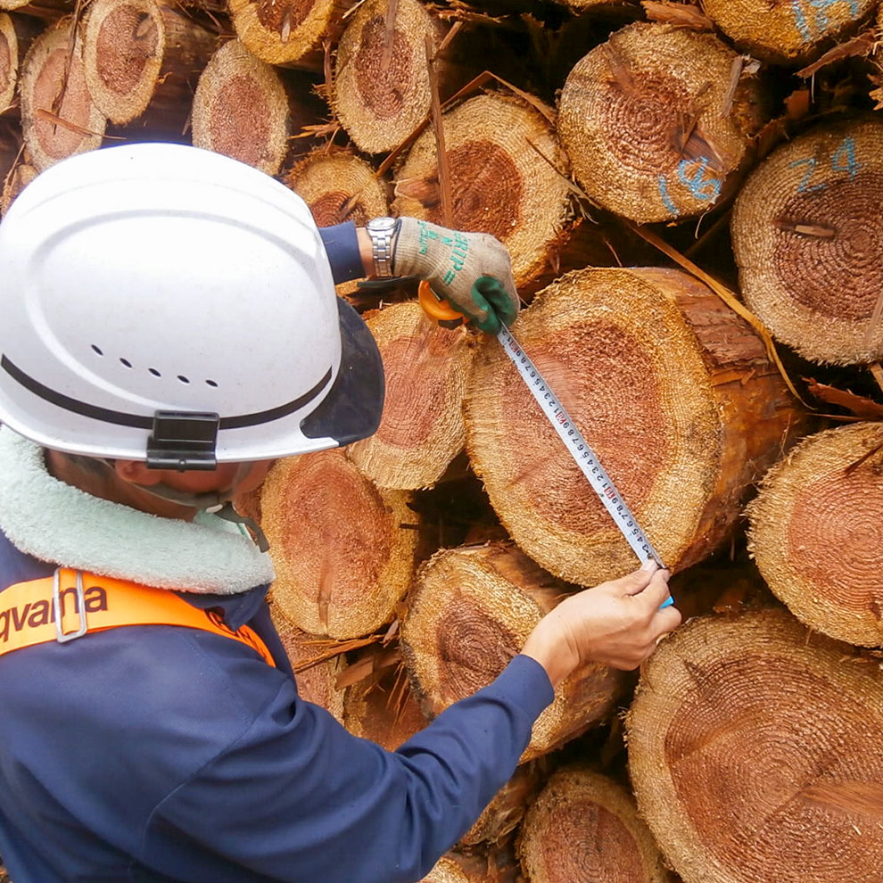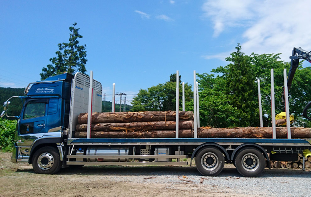 伐倒した樹木を丸太(素材)へと造材し、木材を必要とする企業様へ納品しております。